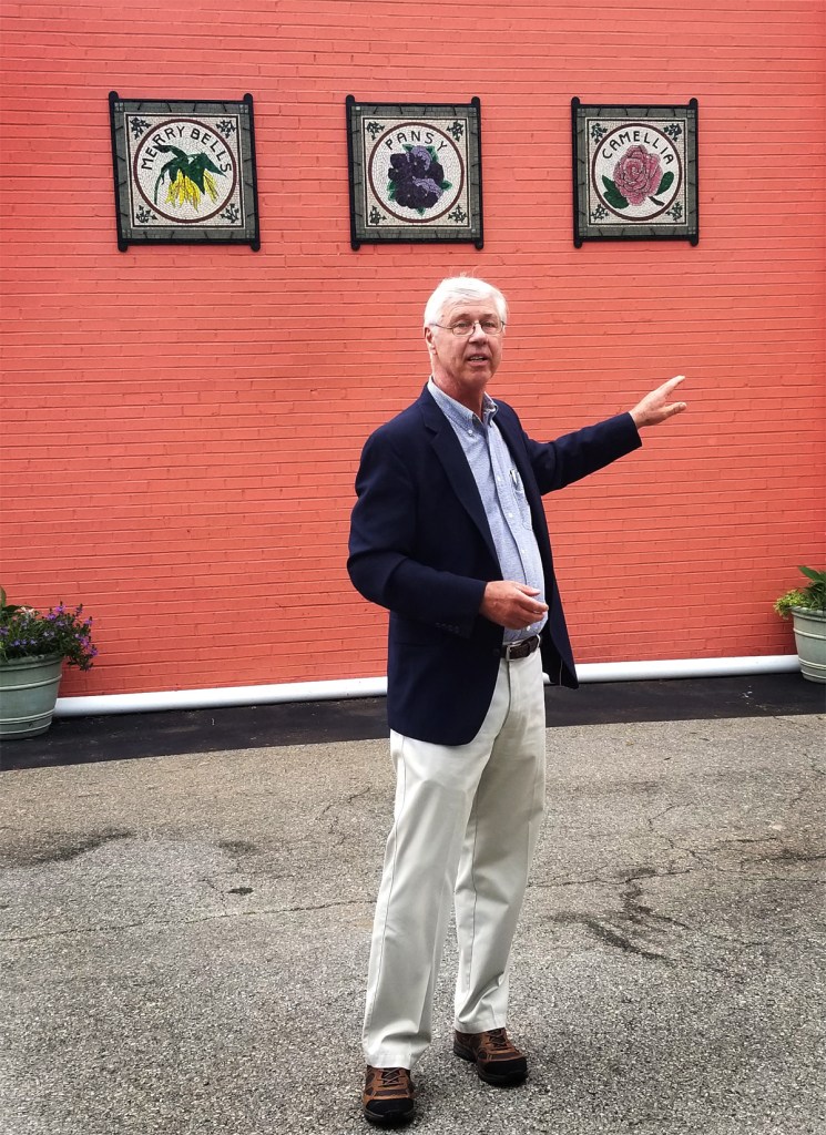 Three floral mosaic panels were designed, created, and installed on the exterior wall to the right of the Bower Center for the Arts main entrance. The dedication of the panels in May 2017 honored Fred Duis, who served as board president of the Wharton Foundation under which Bower Center operated for several years. Sara Braaten former Bower Executive Director helped facilitate this project with the selection of flowers from the Wharton Garden next door to the Center.
