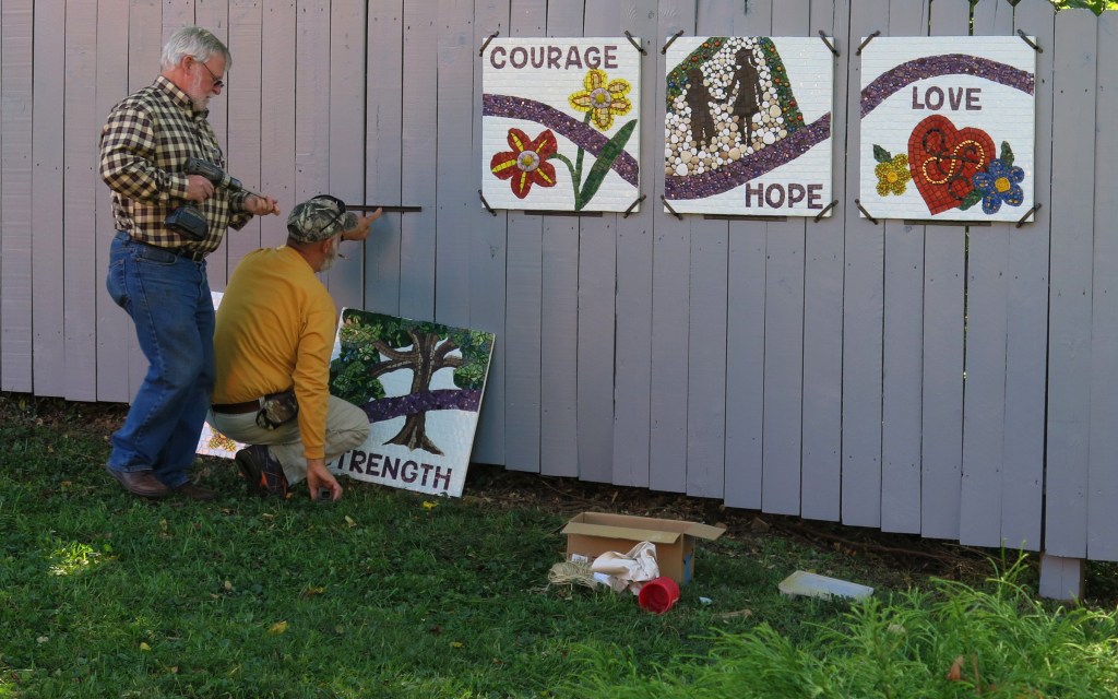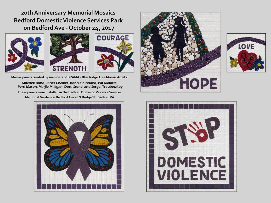Seven mosaic panels were created for the Bedford Domestic Violence Services Memorial Garden on Bedford Avenue (at N Bridge St intersection) and dedicated at the organization’s 20th Anniversary annual vigil on October 24, 2017. The panels were designed by Mitchell Bond based on design elements requested by Heather Jones, former director of BDVS. Mitchell Bond, Janet Chalker, Bonnie Kinnaird, Pat Malotte, Perri Mason. Marjie Milligan, Dotti Stone, and Sergei Troubetzkoy created the five 2’ square and two 3’ square panels. They were installed by Bower Center board members.