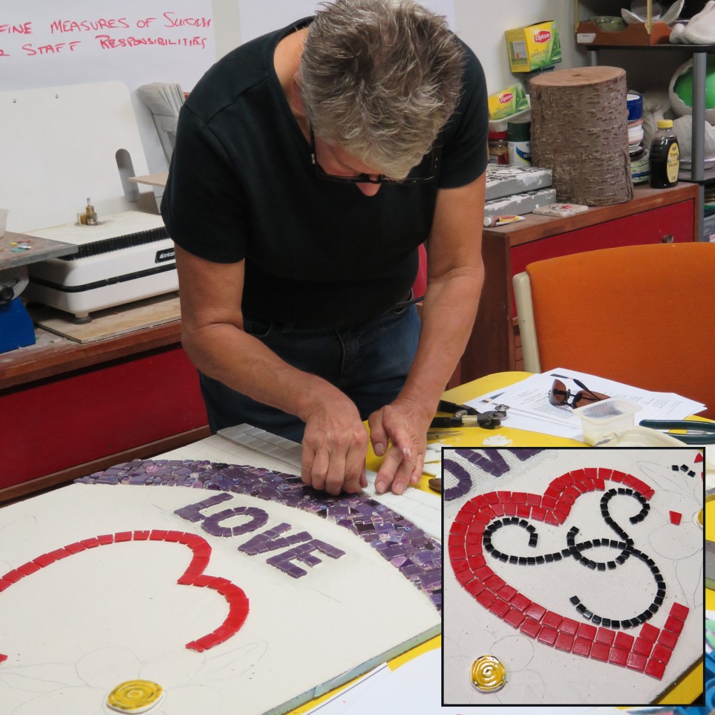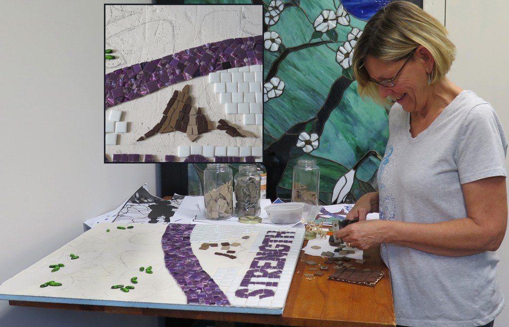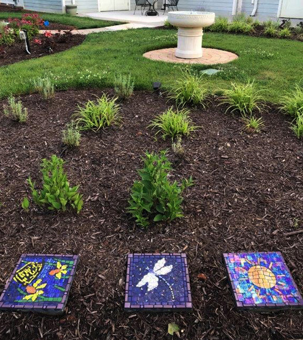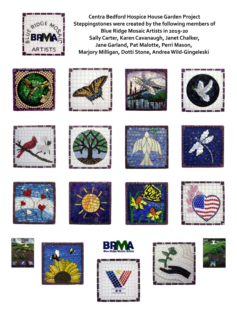 Sixteen mosaic steppingstones for the redesigned garden at the Centra Bedford Hospice House were created by nine members of BRMA. Some will be in groups of two or three, and others placed singly around the garden as decorative elements. Dana Garrett and Anita Lowe of Centra assisted with design ideas and coordinated this garden addition donated by BRMA.