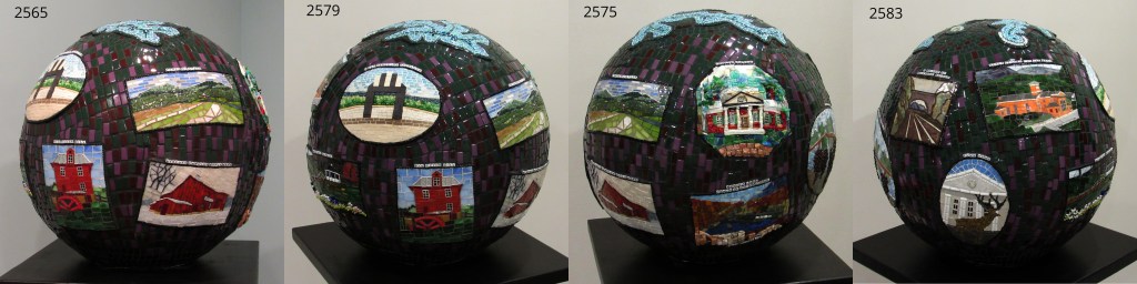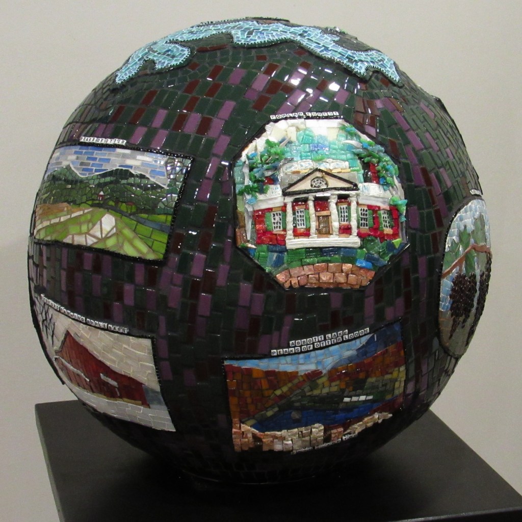 The Bedford Sphere is a mosaiced ball with area sites that include: The National D-Day Memorial, Bower Center for the Arts, Big Otter Mill, Poplar Forest, an apple barn to represent the apple orchards, Wharton Garden, Elks Home, a grape cluster to represent local Virginia wineries, Abbott Lake and Peaks of Otter Lodge looking down from Sharp Top Mountain, the N Bridge Street Railroad Bridge, circa 1900, Smith Mountain Lake, and a view of the Peaks of Otter.