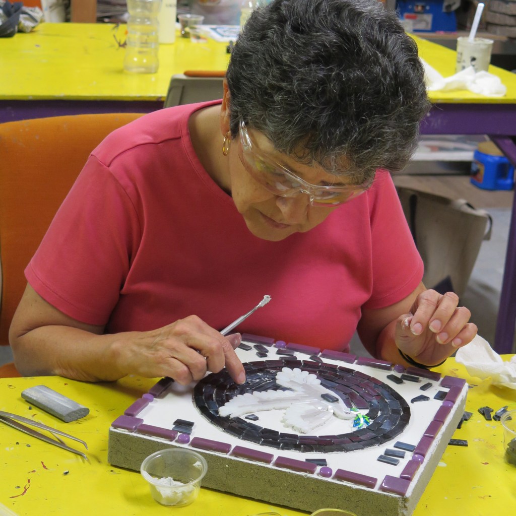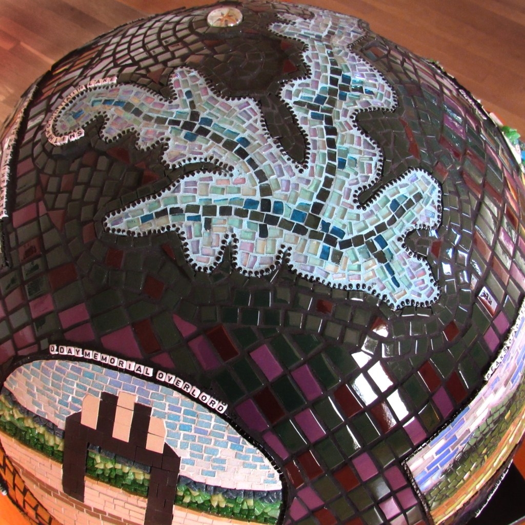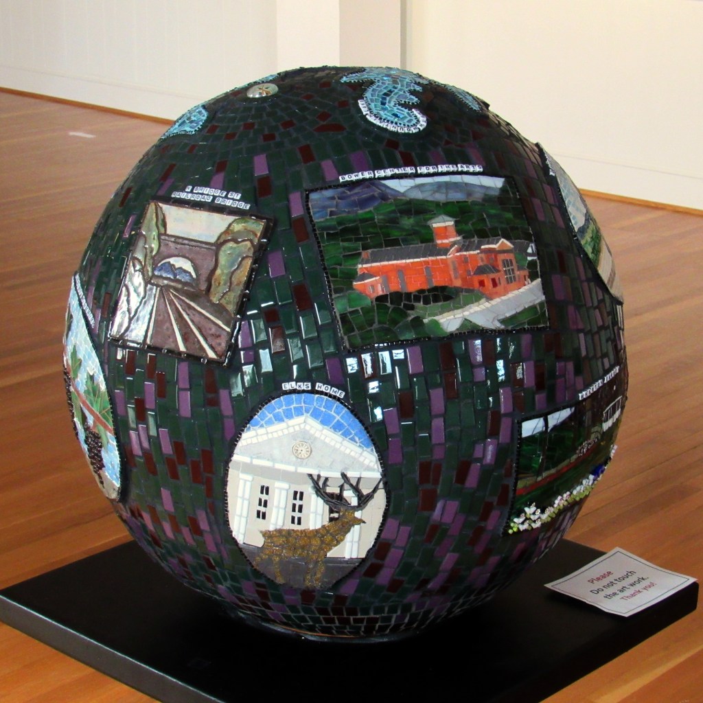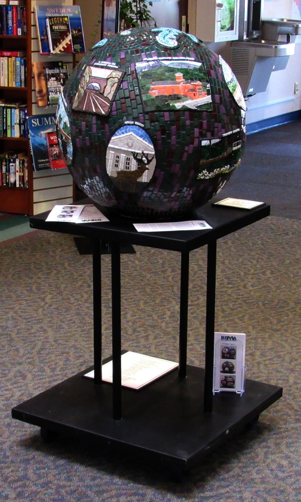BRMA members who created mosaics for this project include: Sophie Adams, Sally Carter, Karen Cavanaugh, Janet Chalker, Jane Garland, Pat Malotte, Perri Mason, Marjory Milligan, Dotti Stone, Sergei Troubetzkoy, and Andrea Wild-Gingeleski. Desmond Black, Past President of the Bower Center Board of Directors, designed and built the rolling base for the sphere.